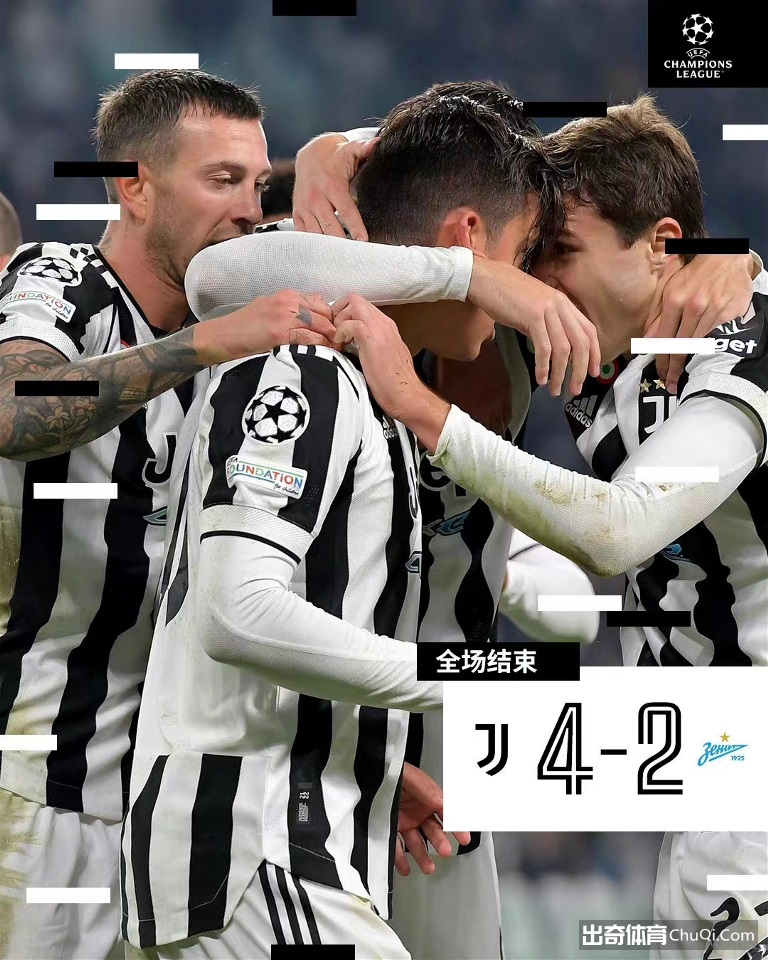 北京时间11月3日04:00,欧冠小组赛H组第4轮,尤文图斯坐镇主场迎战泽尼特。上半场,迪巴拉远射中柱随后破门,卡拉瓦耶夫造博努奇乌龙,莫拉塔进球被判越位在先;下半场,基耶萨造点,迪巴拉点射再度超出比分,随后基耶萨又利用个人能力再下一城,莫拉塔破门扩大比分,阿兹蒙破门扳回一球。最终,尤文主场4-2击败泽尼特,欧冠小组赛四连胜提前出线。