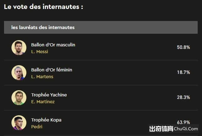 另外,《队报》发起的票选活动中,巴萨球员马腾斯以18.7%得票率领跑女足金球奖,马丁内斯28.3%得票率领跑雅辛奖,佩德里63.9%得票率领跑科帕奖。