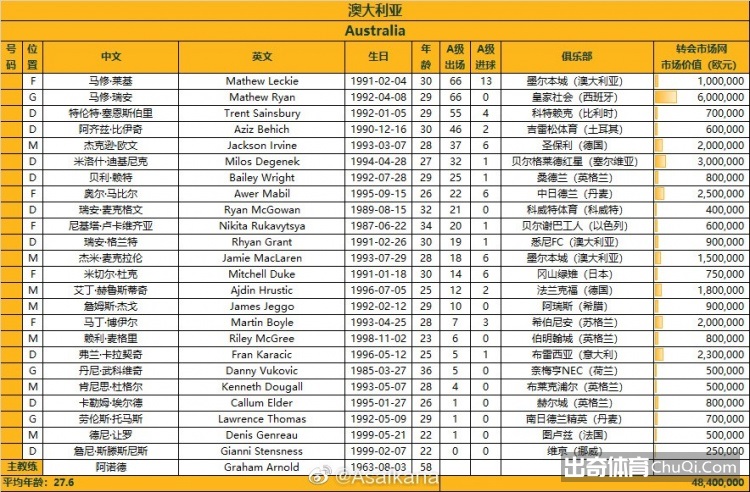 澳大利亚前场如何组合是个看点,罗吉奇伤缺后,赫鲁斯蒂奇很可能替代他的位置。国内联赛老牌前锋莱基上场发挥一般,阿诺德也许会起用身材更为高大些的杜克首发,上一次和中国队交锋时杜克替补出场打进过一球。上一场给国足球员造成了不少麻烦的速度型边锋马比尔仍然会是澳大利亚最大的威胁。