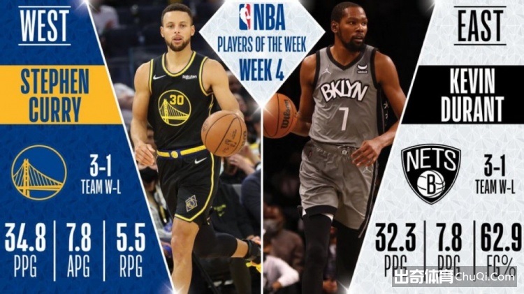 NBA官方公布了上周东西部的周最佳球员,勇士球星库里和篮网球星杜兰特当选。