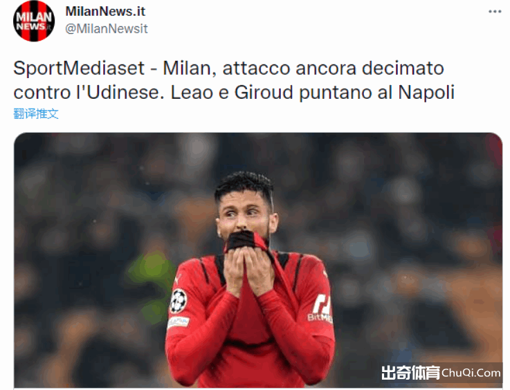 据Mediaset报道,球队目前的锋线伤病比较严重,莱奥,吉鲁,雷比奇和佩莱格里在对阵乌迪内斯的比赛中继续缺席。其中莱奥和吉鲁最快可以在之后对阵那不勒斯的比赛中复出。而雷比奇和卡拉布里亚将要等到 2022 年才可以回归赛场。