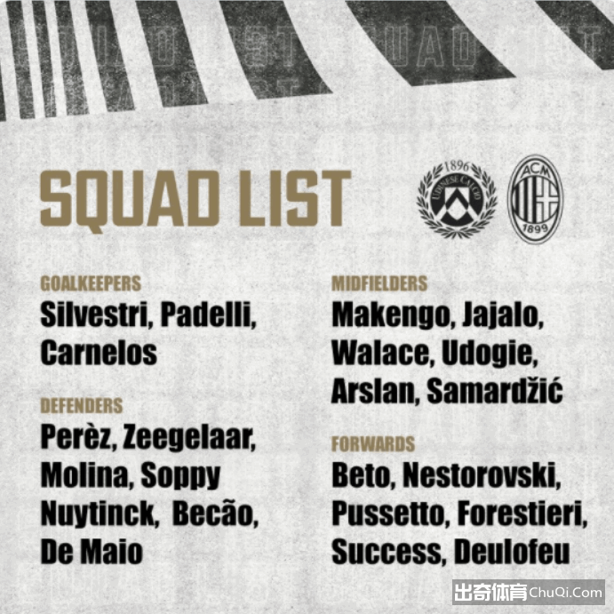 在赛前,乌迪内斯公布了球队对阵AC米兰比赛的大名单