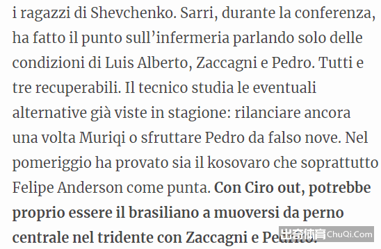 在赛前的会议期间,蓝鹰主帅萨里谈到了目前球队伤病的情况,目前路易斯·阿尔贝托、扎卡尼(1球3助攻)和佩德罗(6球4助攻)三个都预计恢复良好,已经没有肌肉问题。面对因莫比莱的可能缺席,他研究了替代方案:巴西前锋费利佩·安德森(4球3助攻)与 扎卡尼和佩德罗组成新的三叉戟。中场方面,将会是阿尔贝托,卡塔尔迪和 米林科维奇的搭档。在后卫线上将会看到希萨伊,路易斯·费利佩,阿切尔比和马鲁西奇的搭配。
