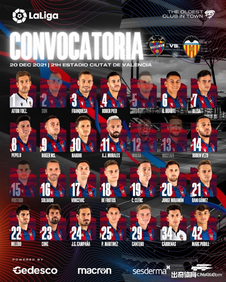 莱万特官方公布了本场比赛的大名单,中场球员迈克尔·马尔萨(Mickael Malsa)(13场1球3助)和后卫索恩(Son)(11场1球)停赛,中场拉多亚(Nemanja Radoja)新冠检测呈阳性缺席,后卫穆斯塔菲(Shkodran Mustafi)(11场1球)、后卫塞尔吉奥·波斯蒂戈(Sergio Postigo)因伤缺阵。