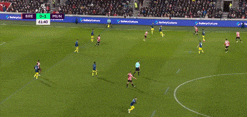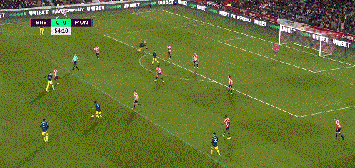 第54分钟,曼联打破场上僵局!弗雷德大禁区前沿一脚斜传至禁区,伊兰加停球摆脱防守球员后头球攻门,皮球飞入球网,0-1。