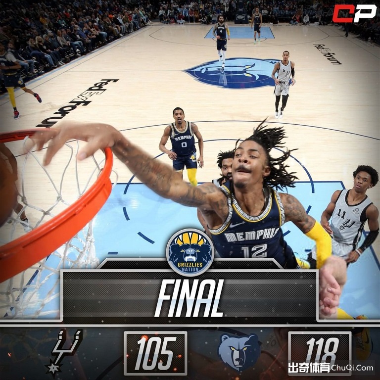 末节决战,马刺在中段将分差迫近至5分,灰熊连得9分没让分差继续缩小。灰熊保持着两位数领先直到最后,以118-105战胜马刺。