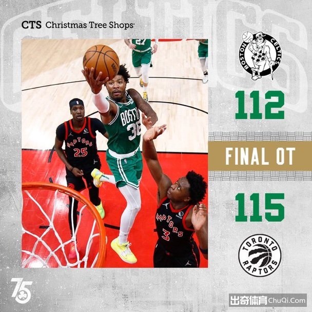 加时赛中,怀特和斯马特在内线连得4分,阿奴诺比命中三分紧咬比分,随后西亚卡姆在内线连续打成,怀特错失反超上篮,凯尔特人只能采取犯规战术,最终,猛龙以115-112加时险胜凯尔特人。