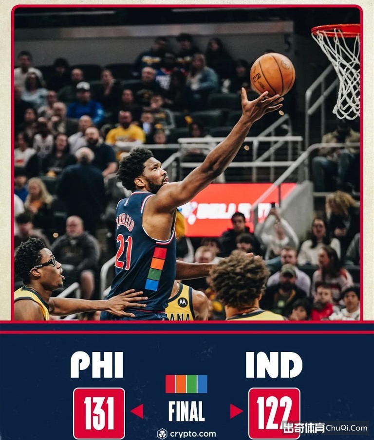 末节决战,乔丹完成空接扣篮将分差扩大至两位数,步行者接连命中三分打出10-4追至4分分差。76人连得11分再度拉开分差,步行者打出6-0追至9分分差。76人带着11分的领先进入最后一分钟,步行者追分不及,最终76人以131-122力克步行者喜提三连胜。