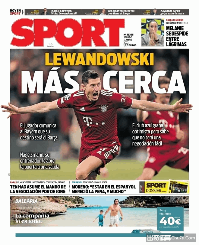 《每日体育报》头版报道,莱万距离巴萨更近了,他已经告诉拜仁,他的下一个目的地是巴萨,拜仁主教练纳格尔斯曼为他的离开打开了大门。