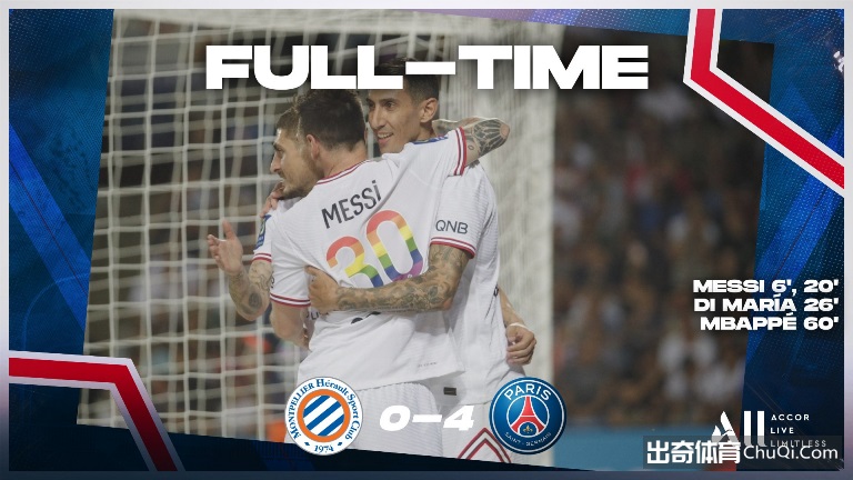 全场比赛结束,巴黎圣日耳曼4-0蒙彼利埃。