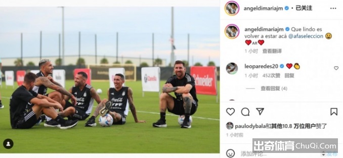 迪马利亚在社交媒体上晒出他与梅西、奥塔门迪、帕雷德斯、洛塞尔索在训练场休息的照片,球员们的脸上都挂着笑容,迪马利亚写道:“再次来到这里真好,阿根廷队😃”