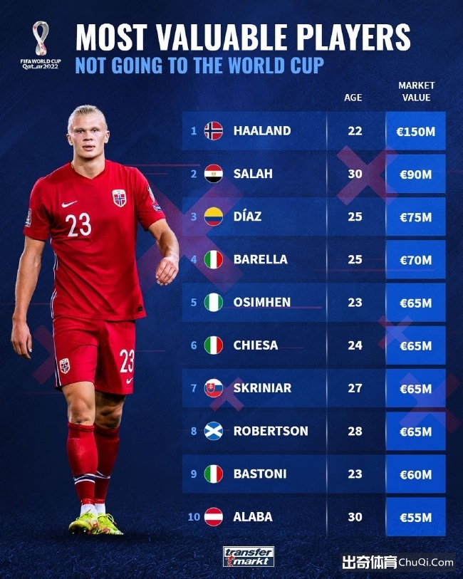 根据德国转会市场最新的统计,哈兰德是所有缺席世界杯的球星中身价最高的,达到了1.5亿欧元。
