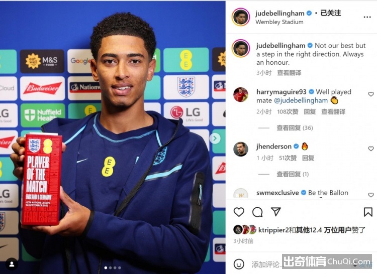 赛后贝林厄姆被评为英格兰队内最佳球员,他在社交媒体上晒出与奖杯的合照,并写道:“这不是我们最好的表现,但朝着正确的方向迈出了一步。很荣幸当选队内最佳。”