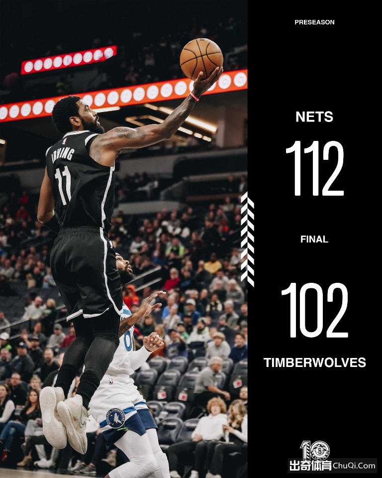 2022-23赛季NBA季前赛继续进行,布鲁克林篮网队用胜利结束季前赛。欧文得到26分和4次助攻,杜兰特得到20分和6次助攻,他们率队上半场确立优势后牢牢掌控比赛,篮网队在客场以112-102战胜明尼苏达森林狼队。篮网队季前赛战绩2胜2负,森林狼队结束4连胜。