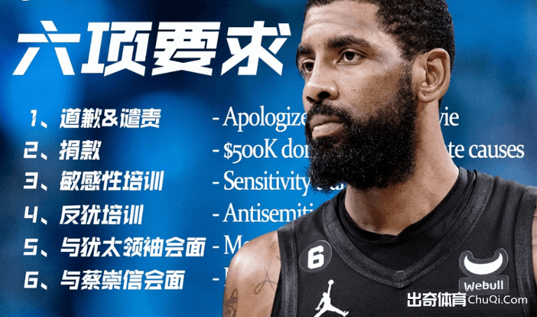 1、道歉&谴责:欧文必须为在10月27日推特转发的电影链接道歉,谴责有害和虚假内容,并明确表示他没有反犹太信仰;
