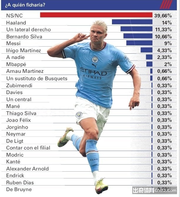 《世界体育报》发出了“您最希望巴萨引进哪位球员”的问题,结果39.66%的人选择了“不知道”、14%的人选择了“哈兰德”、11.33%的人选择了“一名右后卫”、10.66%的人选择了“B席”、9%的人选择了“梅西”。