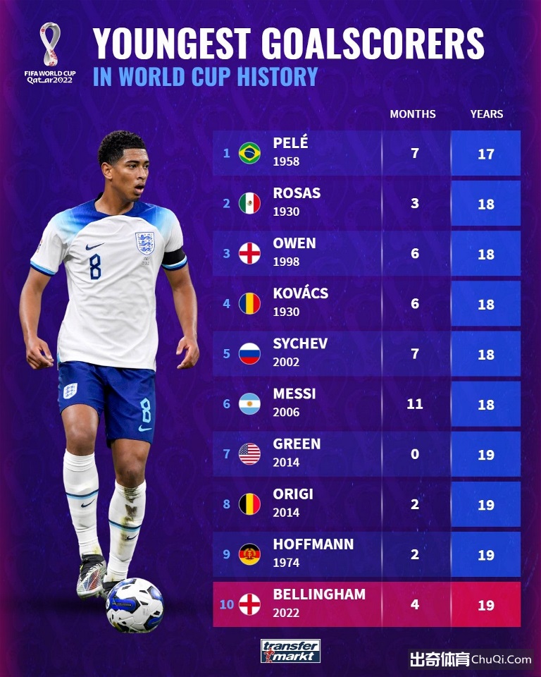 未来可期!贝林厄姆成功跻身世界杯最年轻球员进球榜前十