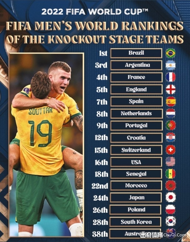 世界杯16强世界排名:7队位居前9,澳大利亚第38位最低