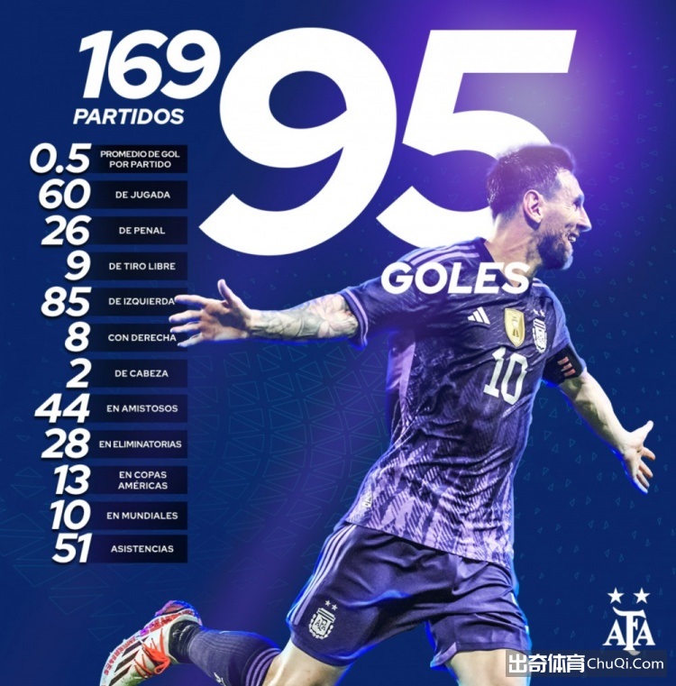 阿根廷官推晒梅西国家队数据:169场95球51助,世界杯打进10球