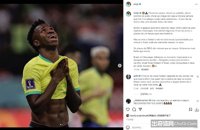 巴西在昨天凌晨的世界杯1/4决赛中点球被克罗地亚淘汰,维尼修斯写道:“我在球场上哭了,在更衣室哭了,在飞机上独自哭泣,回家后我哭了,每当想起我们多么接近,我都会哭……毫无疑问,这是我生命中最糟糕的一天,我太伤心了。”