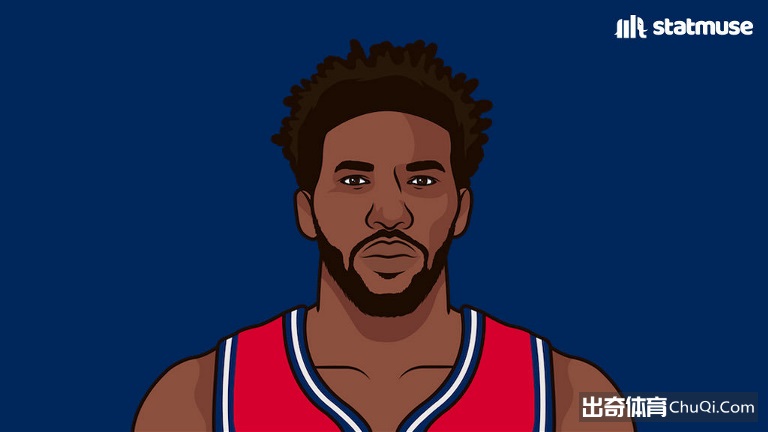 据统计,恩比德生涯至今共有4场比赛至少得到50分10篮板,且命中率不低于60%,联盟合并以来仅次于乔丹(6次)。