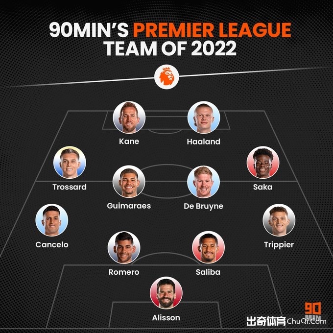 英国媒体90min评选了英超2022年度最佳阵容,哈兰德、凯恩领衔。