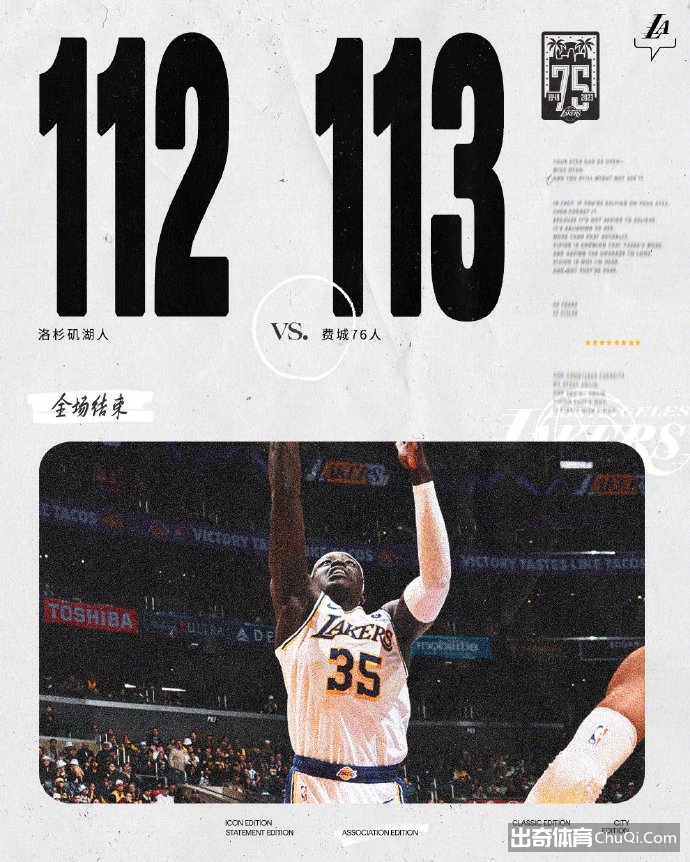 下半场双方互不相让多次交替领先,恩比德和詹姆斯进攻端互爆,威少更是第四节开局不久就拿到三双,悬念也一直留到最后,不过威少最后时刻强杀篮下遭到恩比德和尼昂的联手封盖错失绝杀。最终,76人113-112力克湖人拿下比赛,而湖人遭遇3连败。