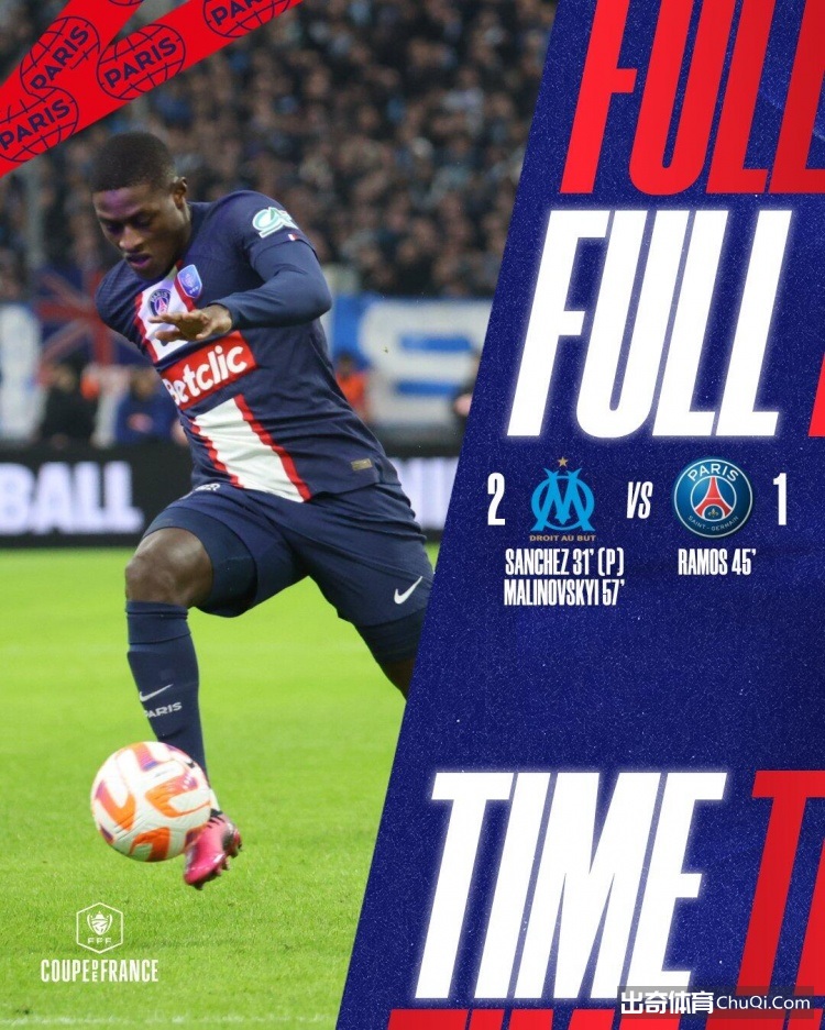 北京时间2月9日凌晨4时10分,法国杯八分之一决赛,巴黎客场对阵马赛。上半场,桑切斯点射首开纪录,拉莫斯扳平比分。巴黎半场1-1战平马赛。下半场,马利诺夫斯基打进一球。最终巴黎1-2不敌马赛,止步法国杯16强。