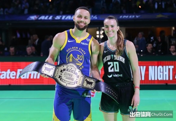 斯蒂芬-库里与WNBA球星约内斯库比拼三分,两人都是用NBA的三分线,但约内斯库用的是WNBA的球,库里用的是NBA的球(比WNBA用球大一号),比赛规则与三分大赛一样,两人将争夺“金腰带”。开场就连中26分!约内斯库率先登场,上来就连中7球镇住全场,之后手感略微走低,射落26分(打平刚刚夺冠的利拉德)!库里随后登场,射落29分夺冠!