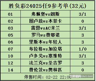 欢迎来到出奇体育《亮哥任九》专栏!上期阿森纳临场前惨遭绝杀;横滨狂轰50脚未能取得进球,常规时间打平;南安普主场落败。今天为大家带来第24025期胜负彩以欧罗巴+欧会杯为主,焦点战包括雷恩vsAC米兰及罗马vs费耶诺。