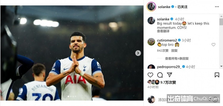 赛后索兰克社媒晒出自己庆祝进球的照片,并写道:“今天取得重要的胜利,让我们保持这样的势头。”