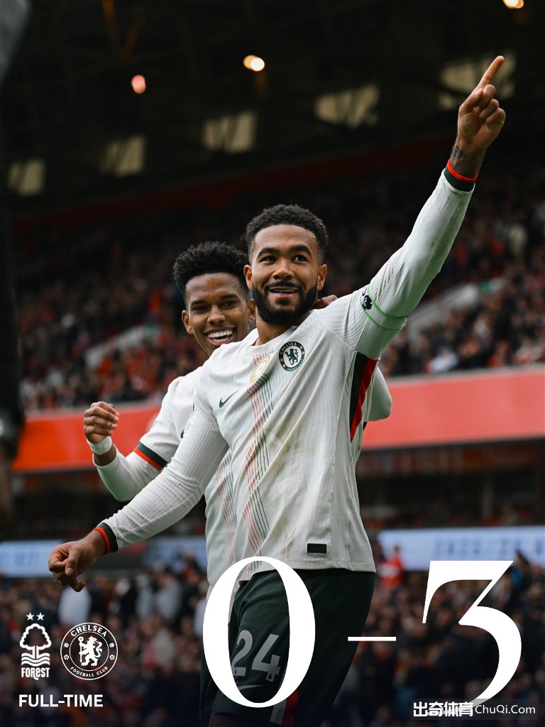 第84分钟,切尔西右侧角球机会,埃斯特旺将球开到门前,塞尔斯击球没有打远,里斯-詹姆斯迎球爆射打进,切尔西3-0诺丁汉森林。