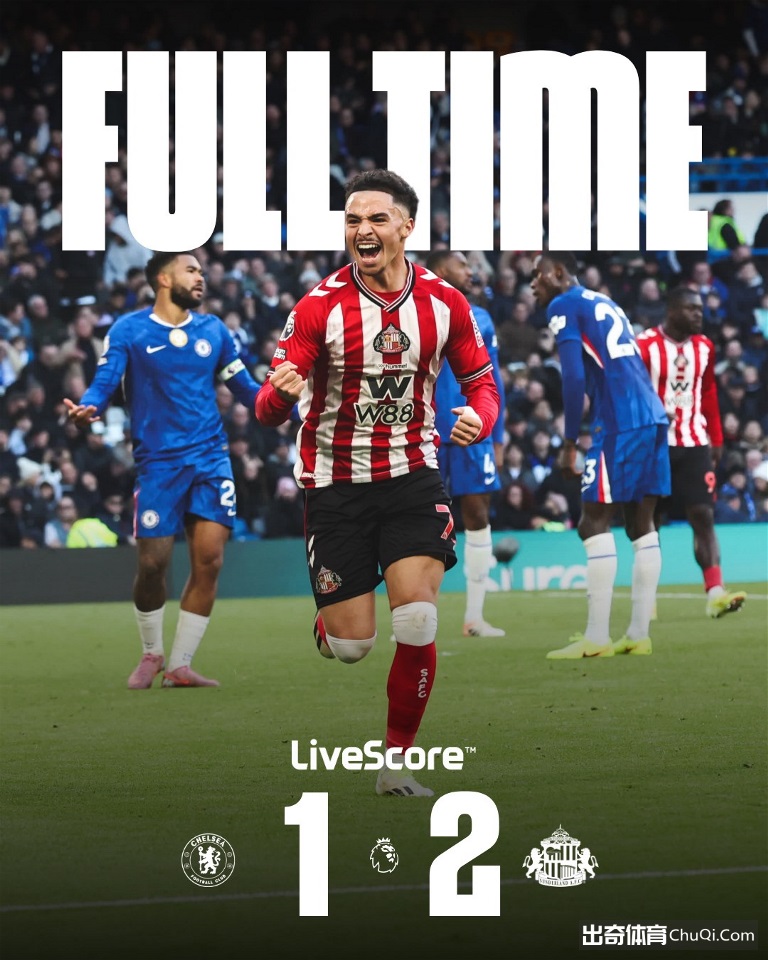 第4分钟,恩佐中场完成抢断,内托策动反击,将球给到前插的加纳乔,后者突入禁区小角度低射,这球从罗夫斯双腿之间穿过进入球门,切尔西1-0桑德兰。