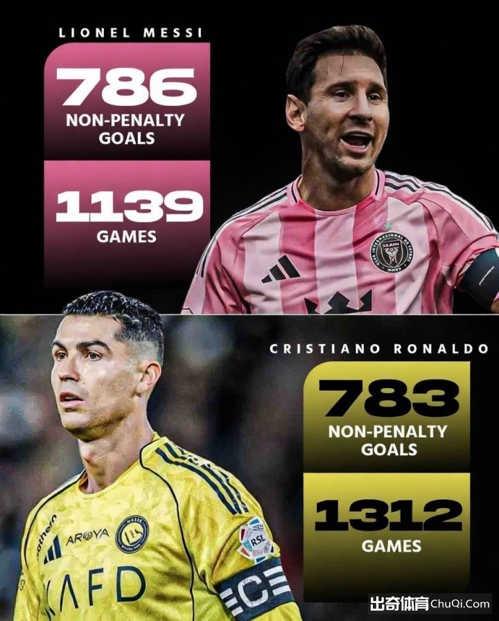 据统计,梅西目前生涯非点球进球数达786球,历史第一。C罗非点球进球数783球第二。