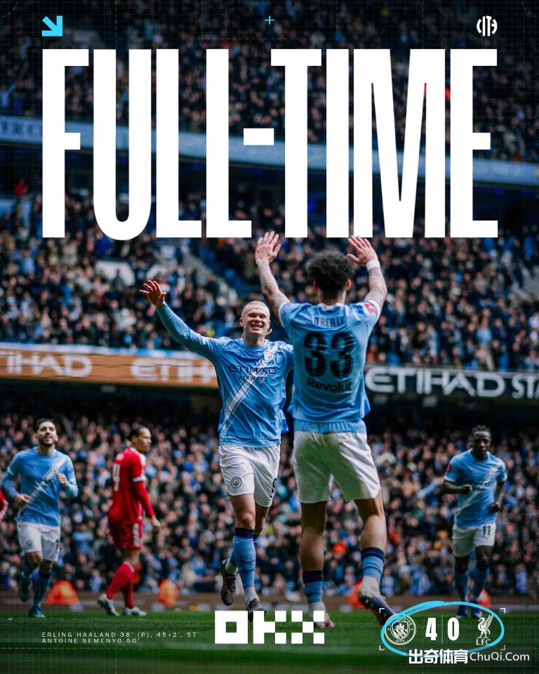 北京时间4月4日下午19:45,足总杯1/4决赛,曼城在阿提哈德球场对阵利物浦。上半场,萨拉赫失单刀,范戴克送点哈兰德操刀命中,哈兰德头球压哨破门。下半场,谢尔基助攻塞梅尼奥巧射进球,奥赖利助攻哈兰德戴帽,萨拉赫失点。全场结束,曼城4-0利物浦,挺进四强。