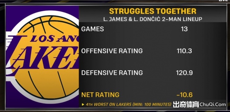 东契奇&詹姆斯同台13场进攻效率110.3防守效率120.9净效率-10.6自湖人至少100分钟同台的二人组里第4差